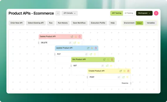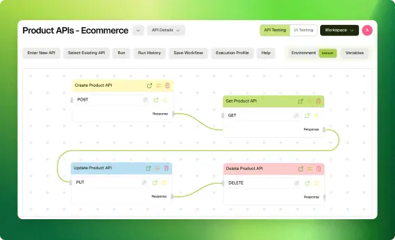 Run your full workflow in one workspace. Configure environments, manage shared test data, and kick off the entire journey with one click. When something fails, results show you the exact step, the data state at that point, and what went wrong.